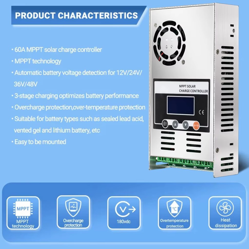 100% MPPT vezérlőAutomatikus akkumulátorfeszültség érzékelés 12V/24V/36V/48VPV bemenet max. 150VMax. 60A töltőáram