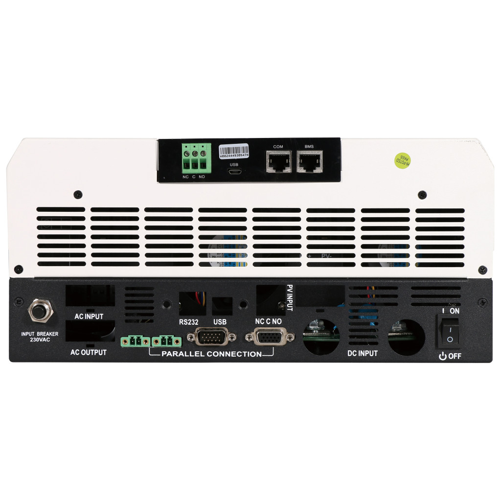Akku oldalTámogatja az ólom-savas és a lítium akkumulátorok csatlakoztatásátBMS kommunikációs RJ45 csatlakozó (RS-485, RS-232, CAN)Akkumulátor feszültség: 42-62V DC, túlterhelés elleni védelemMaximális hatékonyság: 95%Készenléti fogyasztás: kisebb, mint 55WMaximális töltés napelemről: 120AMaximális töltés hálózatról: 100A