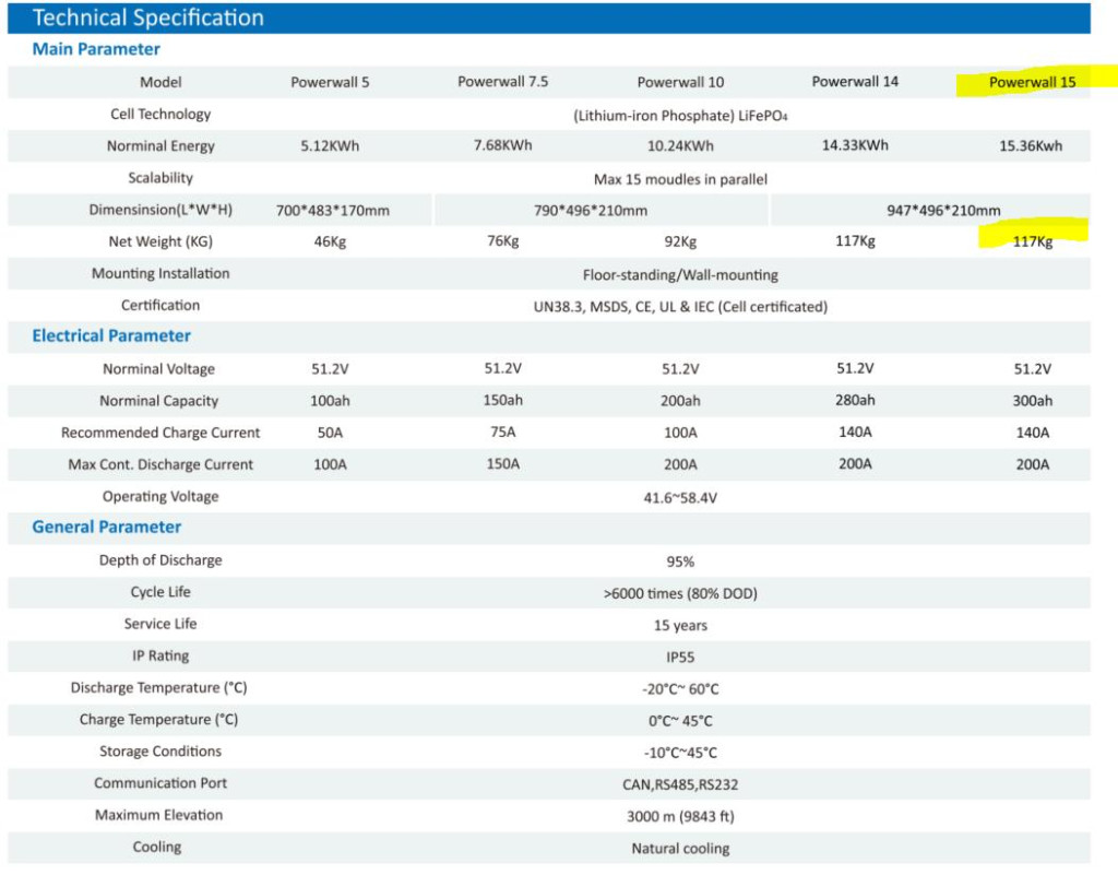 Főbb jellemzőkKimeneti teljesítmény: max. 10 kWCiklusélet: akár 6500 alkalommalAkkumulátorcella: A osztályú LiFePO4 akkumulátorcellákKapacitás: 300 Ah, 51.2V, 15.36kWhKommunikációs port: CAN, RS-232, RS485Falra szerelhető Powerwall